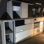 De keukens beslaat de gehele linkerzijde van de camperbus en worden afhankelijk van het type en lengte bestelbus op maat gemaakt. De diepte van de keukens is (op het breedste punt) ca. 450mm. Hierdoor hebben ze een verrassende hoeveelheid bergruimte.