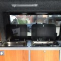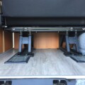 Uitrusting: twee draaibare voorstoelen, 3 persoons Schnierle slaap/zitbank (gekeurd en als extra zitplaatsen op kenteken), 2 slaapplaatsen (bij uitklapen slaap/zitbank) beneden, 2 slaapplaatsen boven, bed in slaaphefdak kan middels gasveren in de nok van het dak worden gebracht, keuken van populierenhout aan beide kanten gelamineerd met oersterk HPL, keukenapparatuur (koelkast, gootsteen, gaskookstek) van Dometic, schoon- en vuilwatertank in keuken, wegklapbare tafel die verwijderd kan worden, pvc vloerdelen van Gelasta,